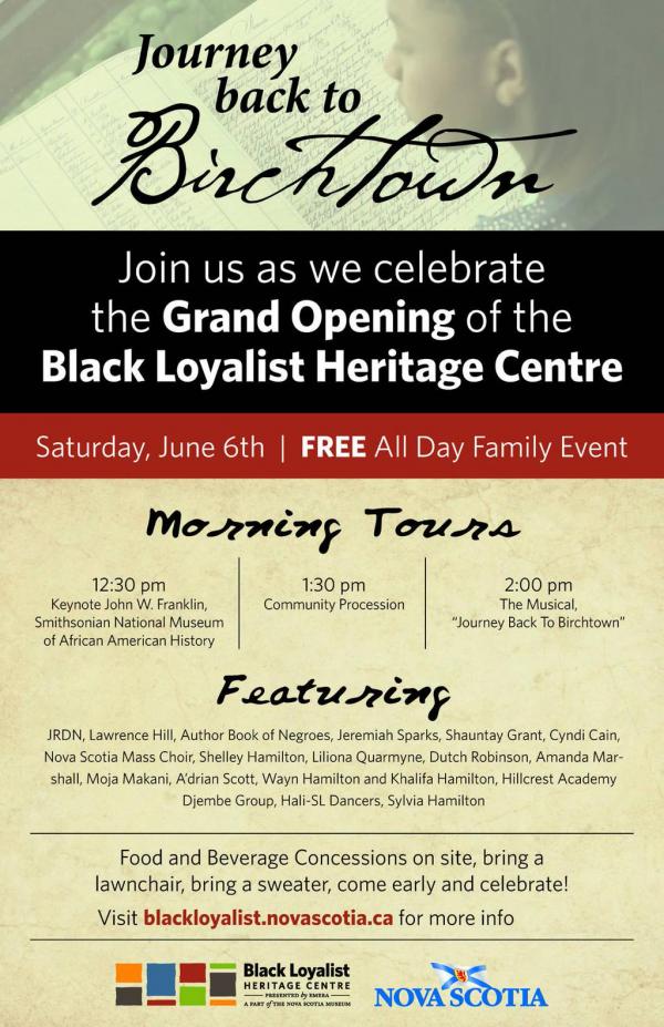 Join us as we celebrate our official grand opening, The Journey Back to Birchtown, on June 6. The Journey Back to Birchtown is a FREE outdoor event featuring performances by African Nova Scotian artists and a multi-media stage presentation. Performers include Juno award-winner JRDN, Jeremiah Sparks, Dutch Robinson, Shelley Hamilton, Cyndi Cain, the Nova Scotia Mass Choir, the Sierra Leone dancers, Shauntay Grant, Hillcrest Academy Djembe Group and many more. The program will also feature John Franklin of the Smithsonian National Museum of African American History and the Book of Negroes author Lawrence Hill.